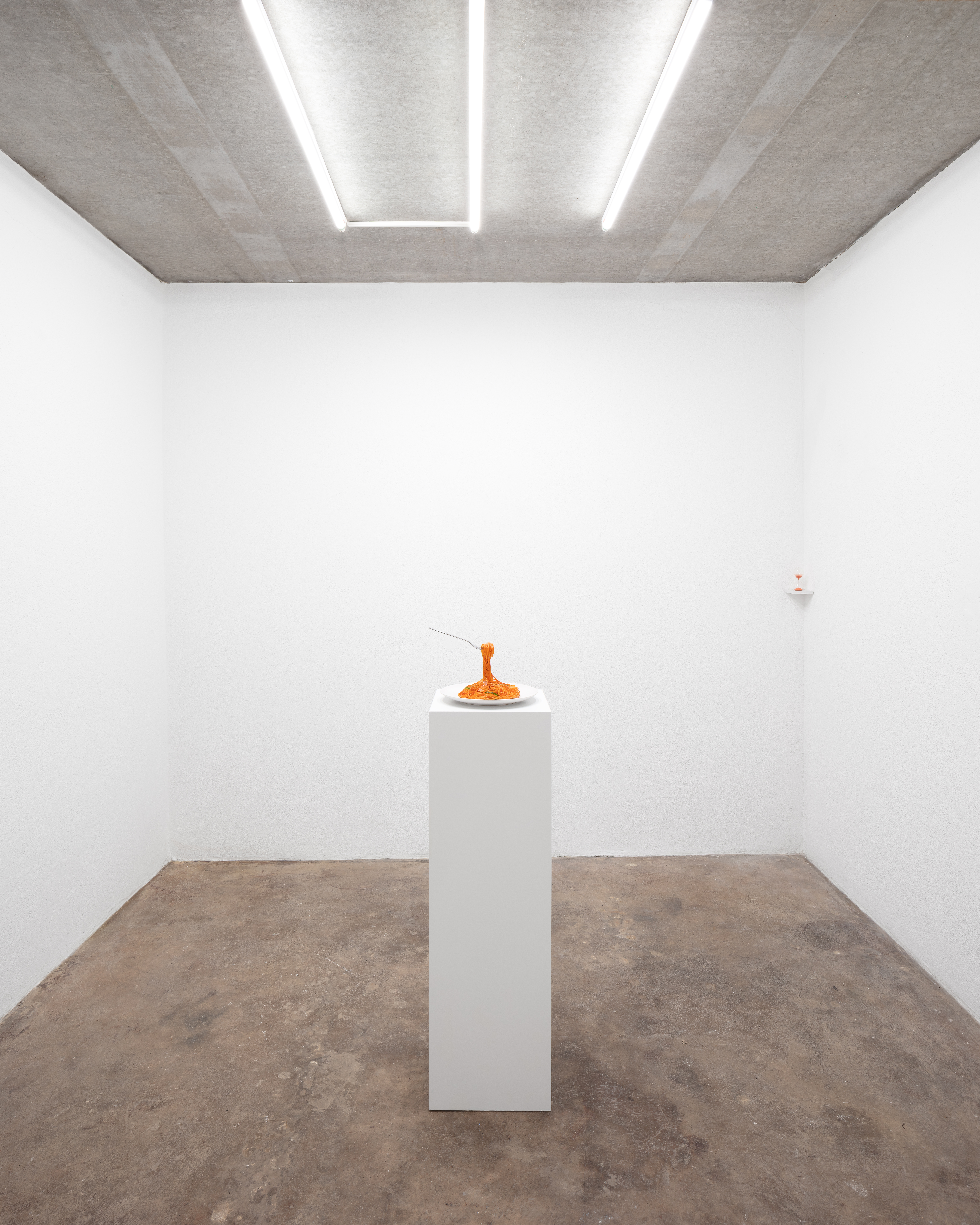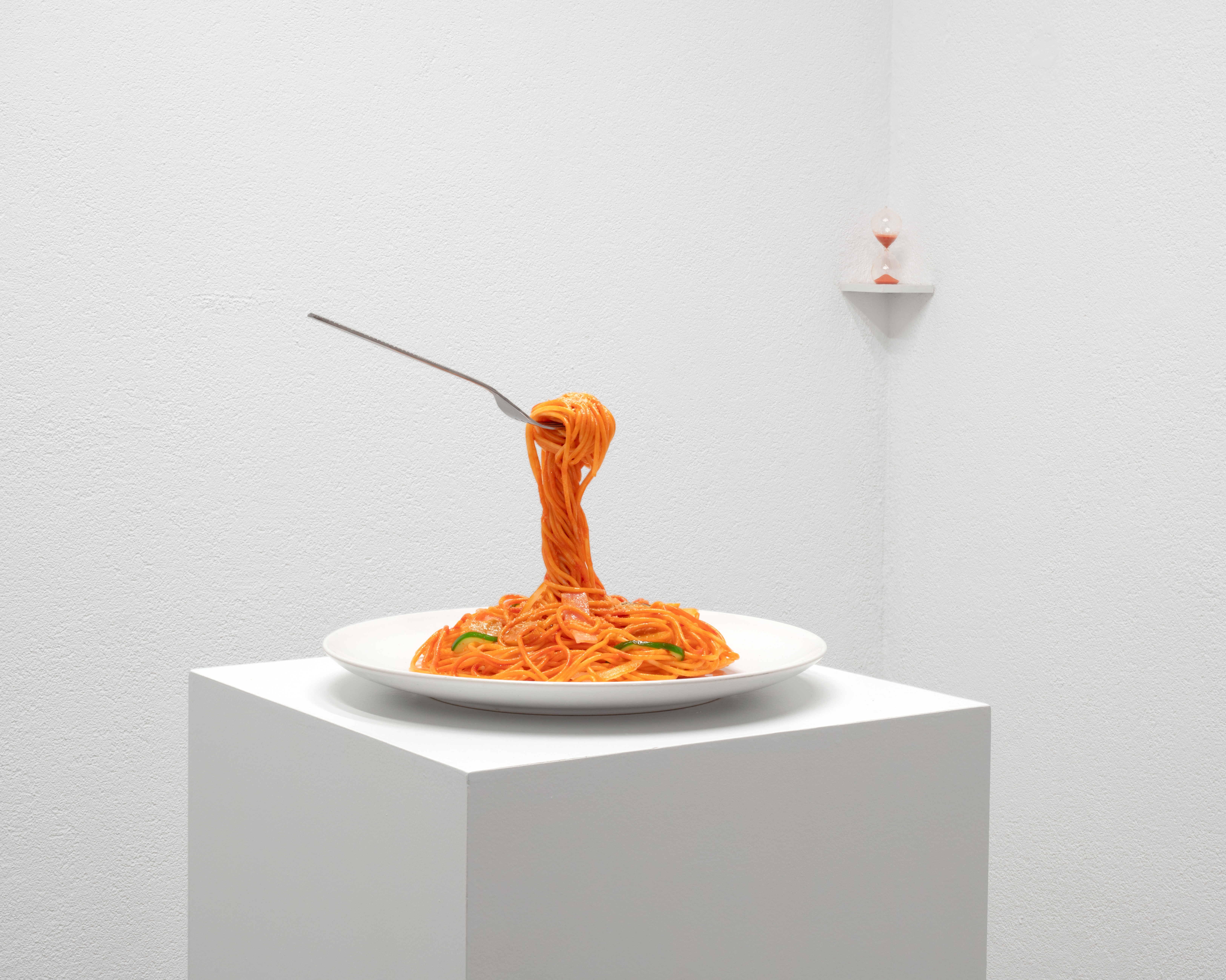 readymade pasta, plate, fork, hourglass