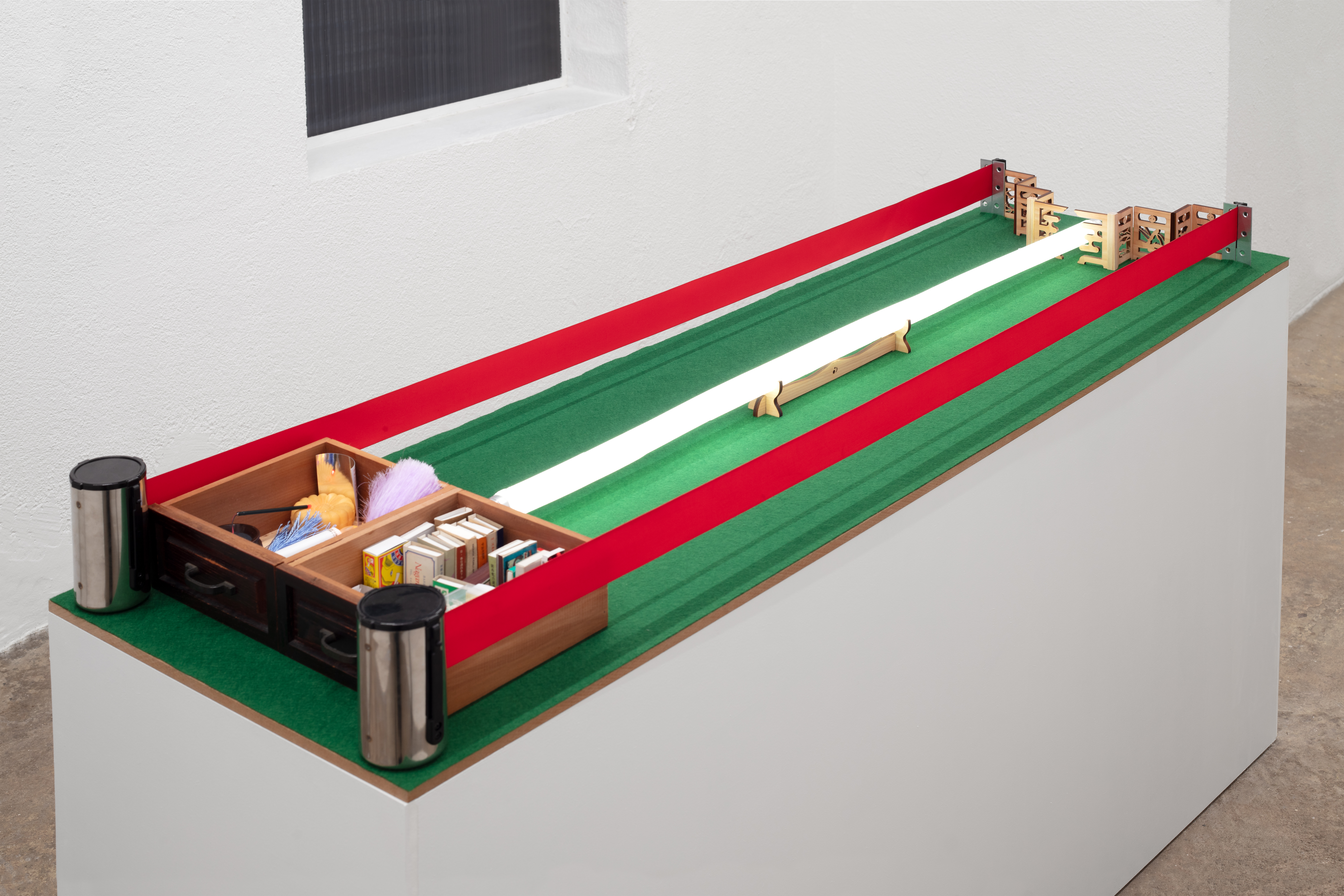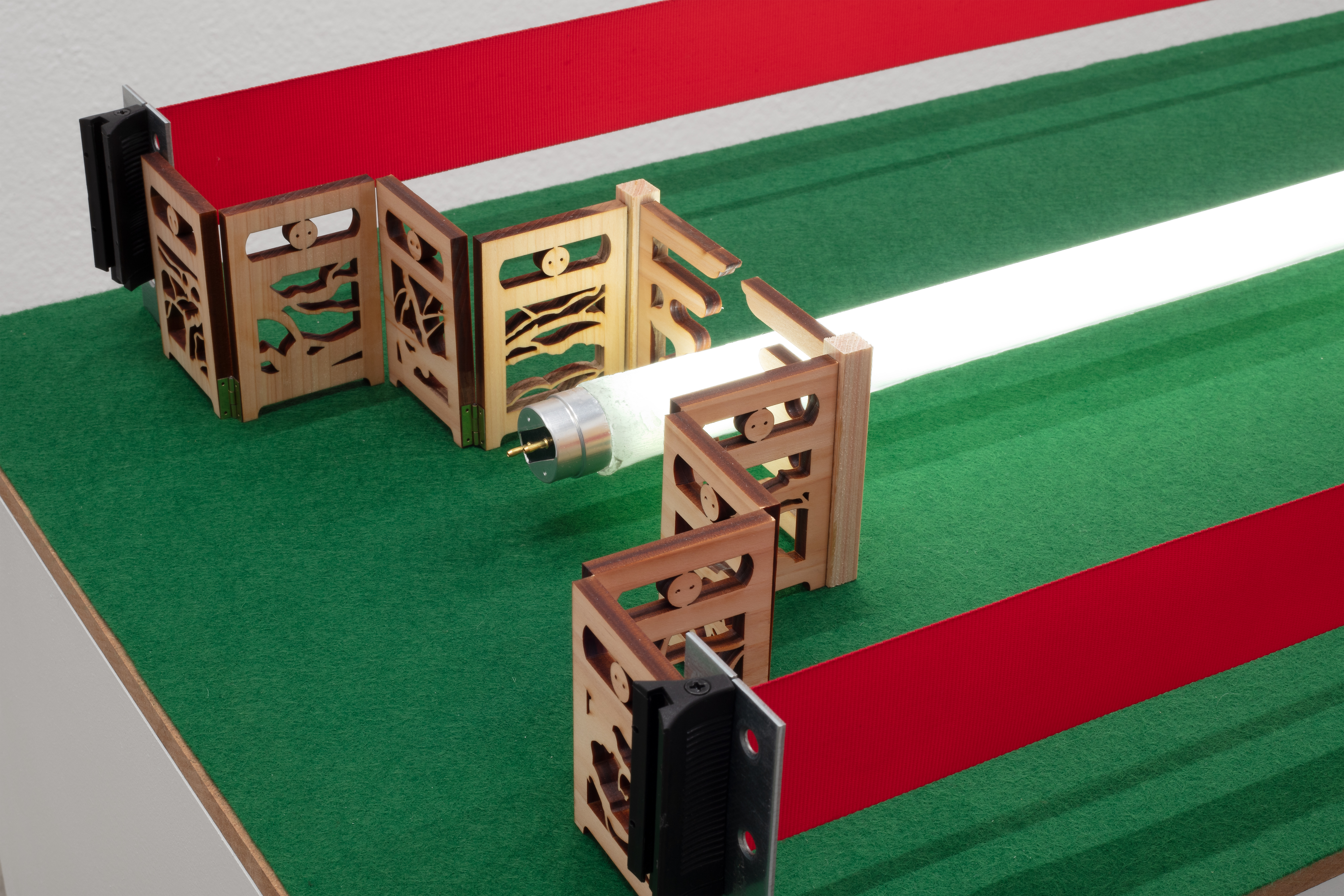 wood, felt fabric, crowd control belt,
